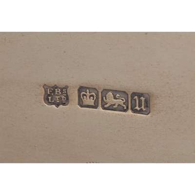 Fenton Bros., Sheffield 1912, of oval outline with a raised cast scroll and shell border, raised on four bracket feet