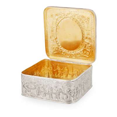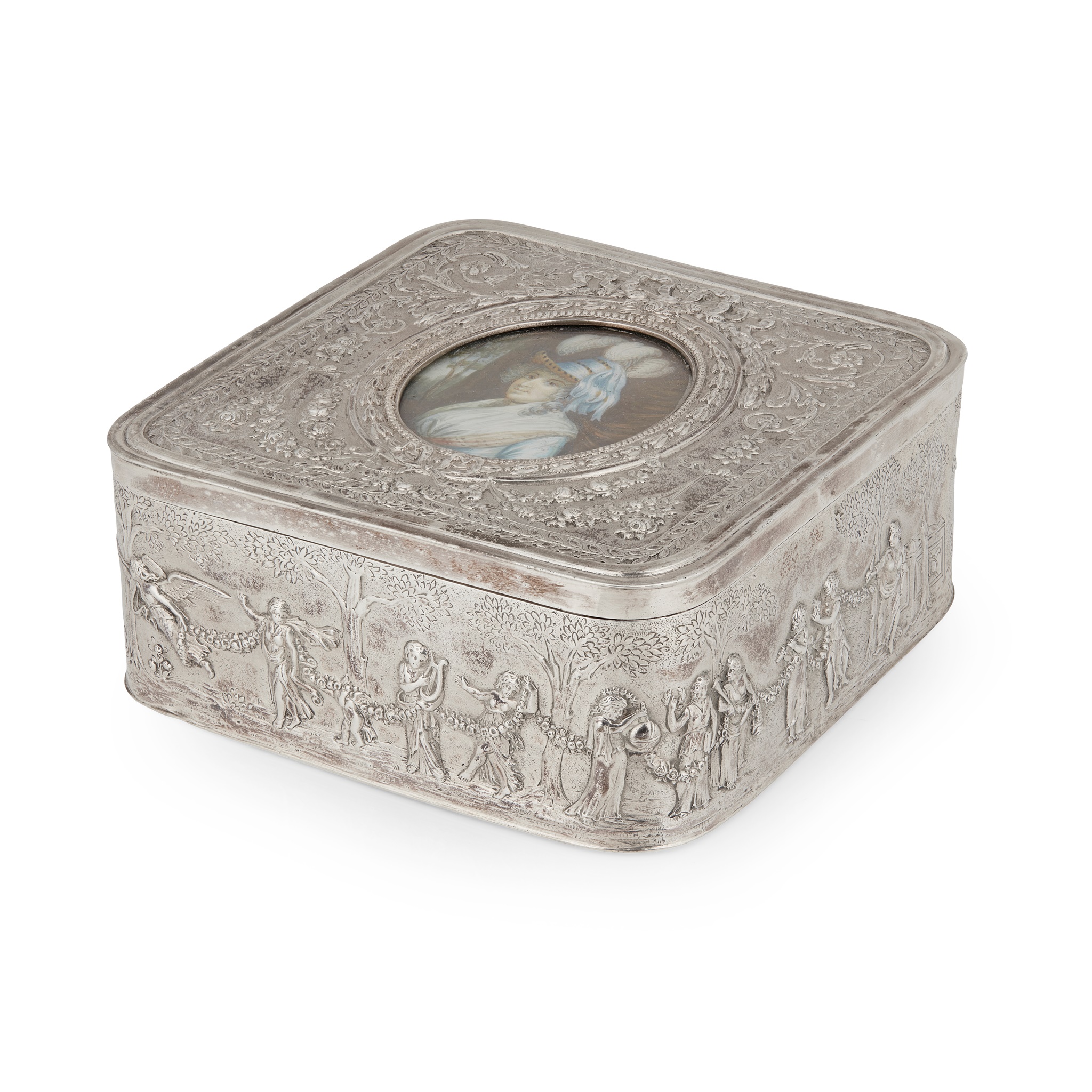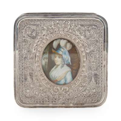 GH, 1910, of rounded square outline, chased Classical scenes depicted to the sides, the hinged lid inset with an oval painted portrait miniature in a chased floral and foliate border, gilt interior