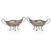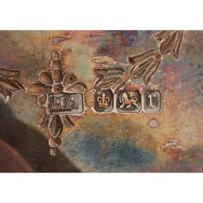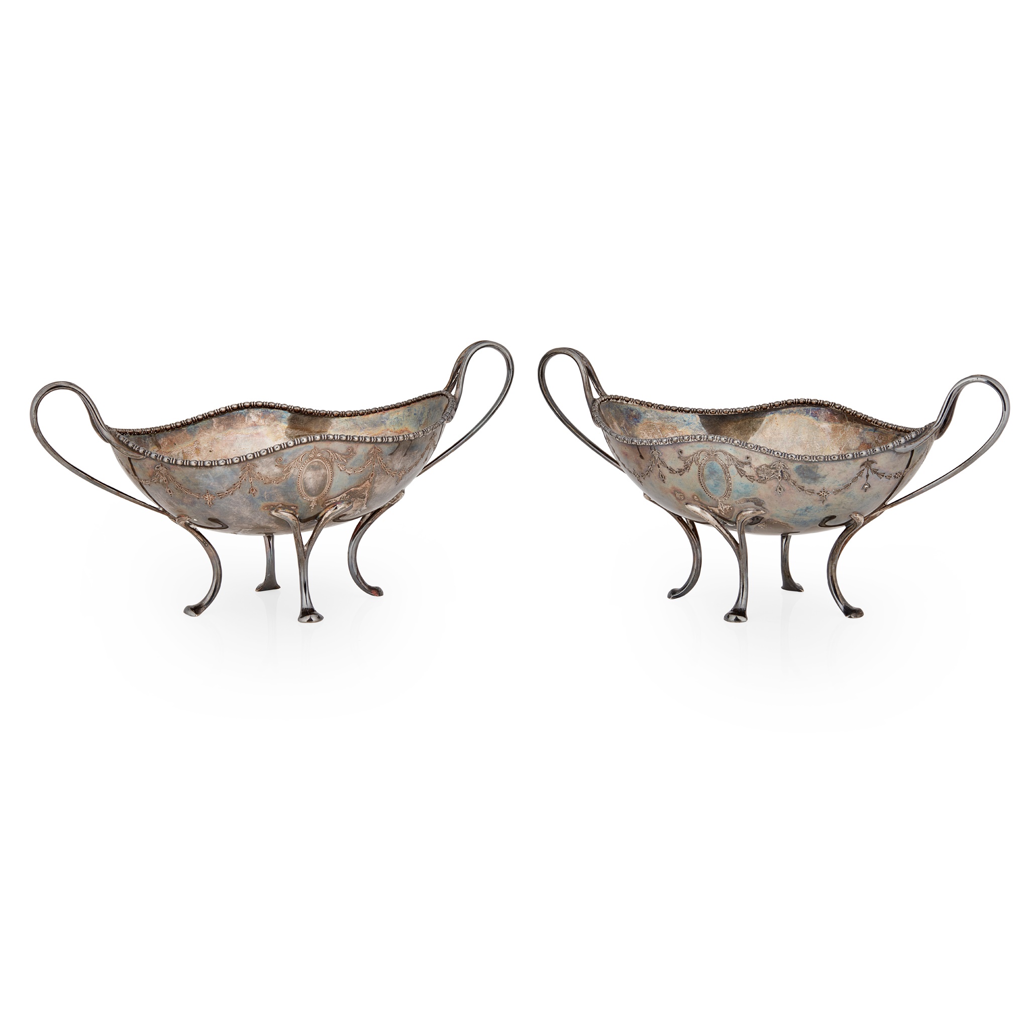 Atkin Brothers, Sheffield 1909, each of oval outline with a beaded border, engraved oval cartouche with garland borders, C-scroll handle, raised on four paw feet