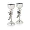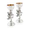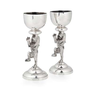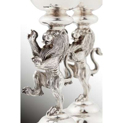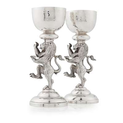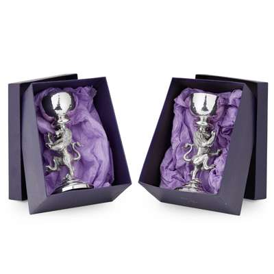 Hamilton & Inches, Edinburgh 2004, designed by Nicole Williams, the stem to each modelled as a lion rampant, to a domed circular foot with feature hallmarks, the sconce of hemi-spherical form with a silver-gilt interior, with a fitted blue glass liner, each with original Hamilton & Inches pochette and box