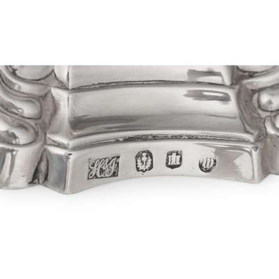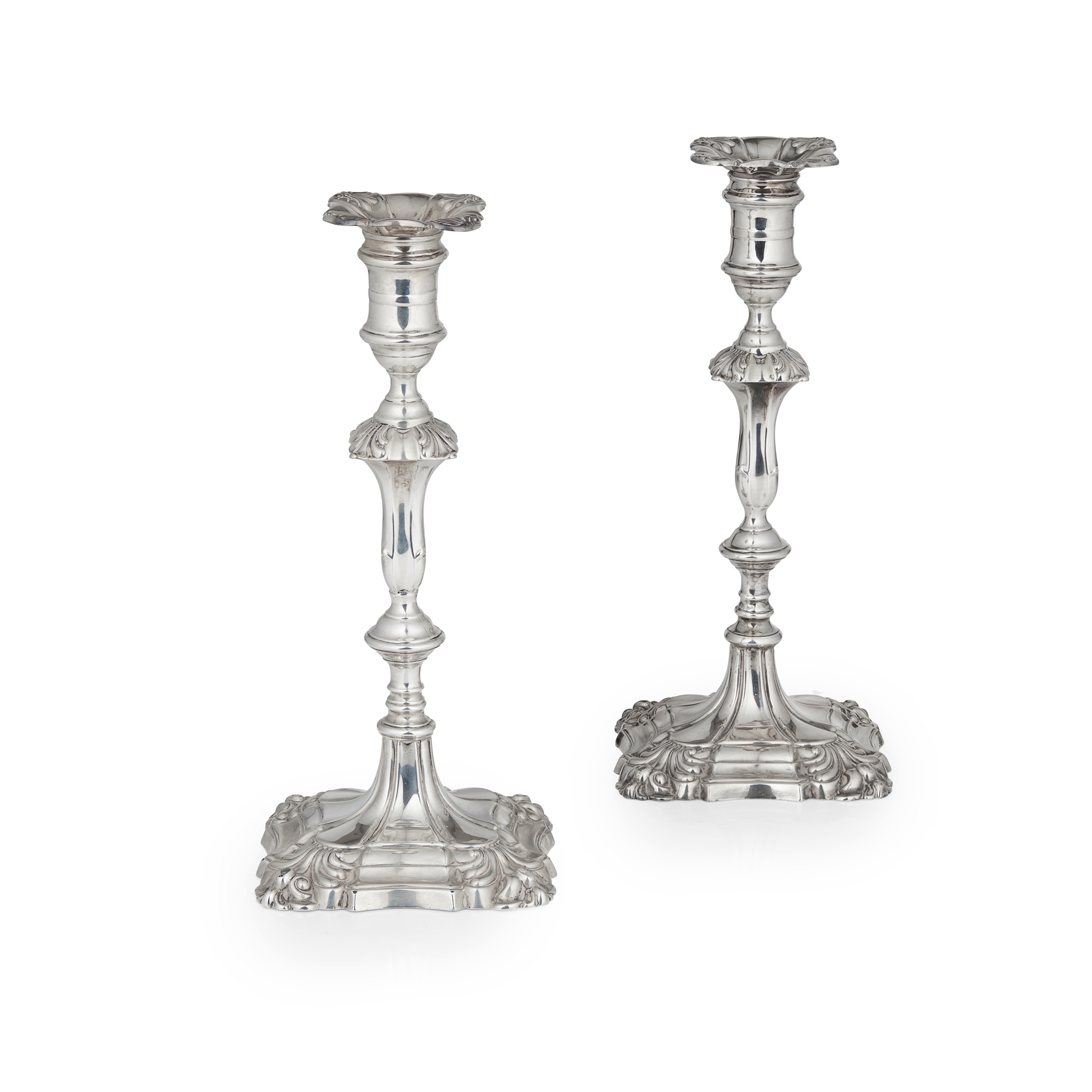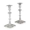 Hamilton & Inches, Edinburgh 1902, in the George III fashion, each of baluster form, with foliate clasped knops, to a moulded square base with foliate detail to each corner, engraved to base 'TO MARTIN AND DINAH', to one and 'FROM GRANDMA' to the other, the sconces each of similar foliate decoration (loaded)