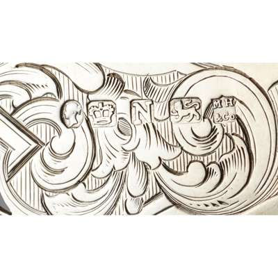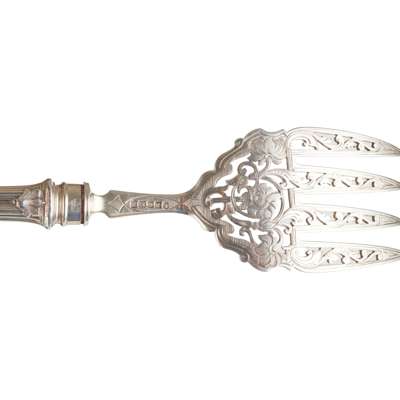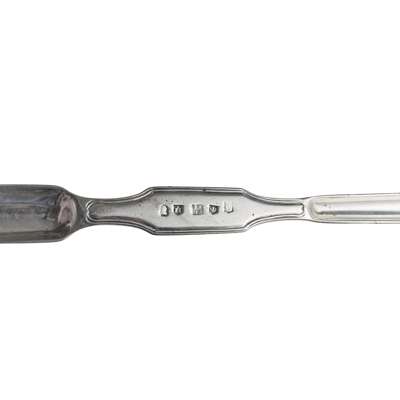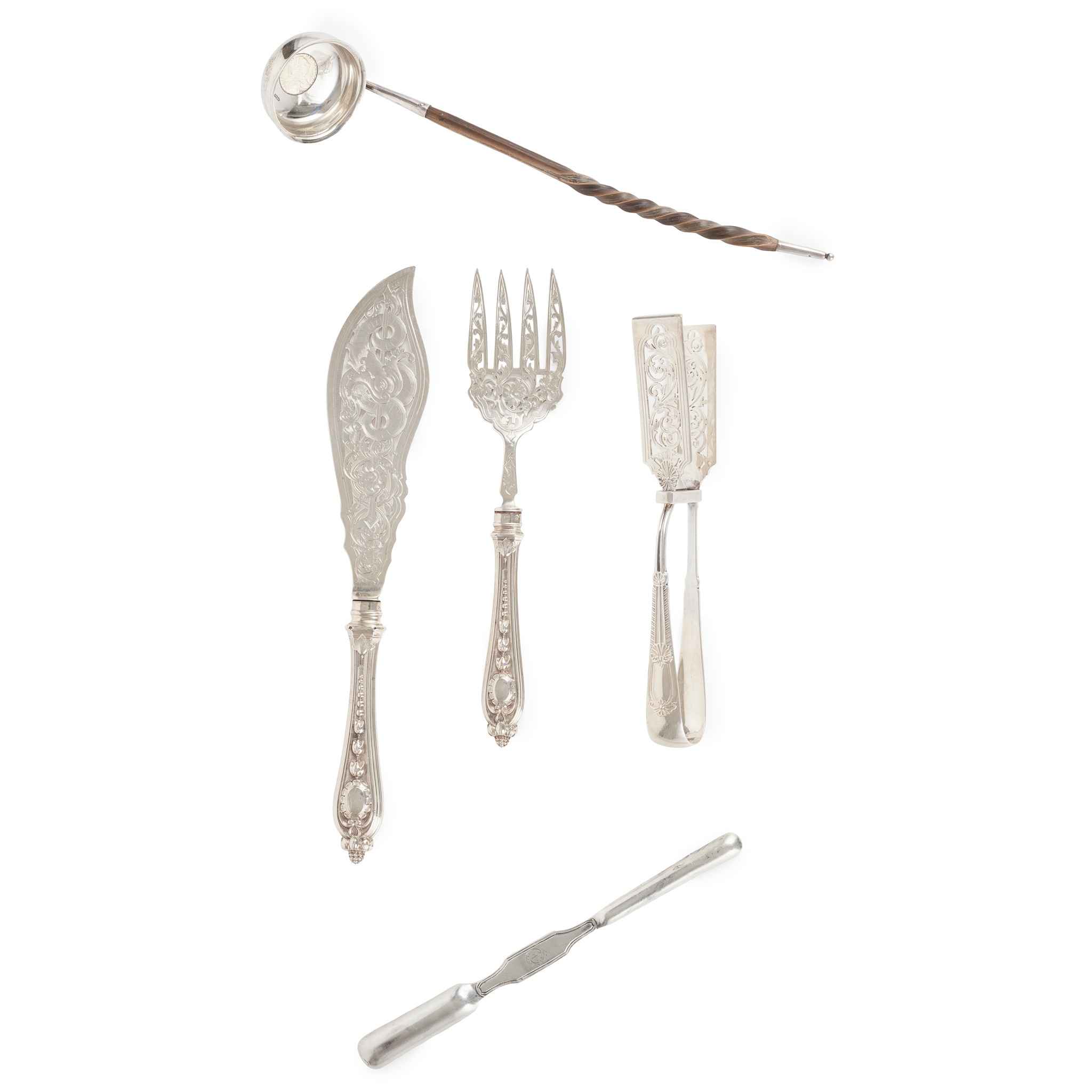 Edinburgh 1801, with threaded detail and engraved garter with New Club and the number 4; together with a punch ladle, Patrick Cunningham, Edinburgh 1811, of traditional form, baleen twisted handle and coin inset to bowl; a pair of Victorian servers, Martin, Hall & Co, Sheffield 1856, each with pierced foliate blades and prongs, the handles with ornate decoration and budding floral finials and a pair of shell and foliate scroll asparagus tongs, Goldsmiths & Silversmiths Co Ltd, London 1901