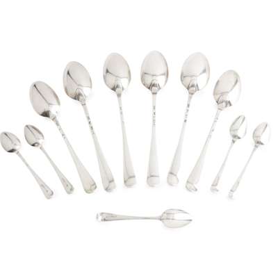 John Donald, marked ID, town mark, ID, town mark, of Old English pattern, initial and the numbers 1 and 2 engraved to terminal; together with another similar pair Patrick Robertson, Edinburgh and a set of five teaspoons, Dorothy Langlands, Newcastle, with bright-cut decoration and initials engraved to terminal