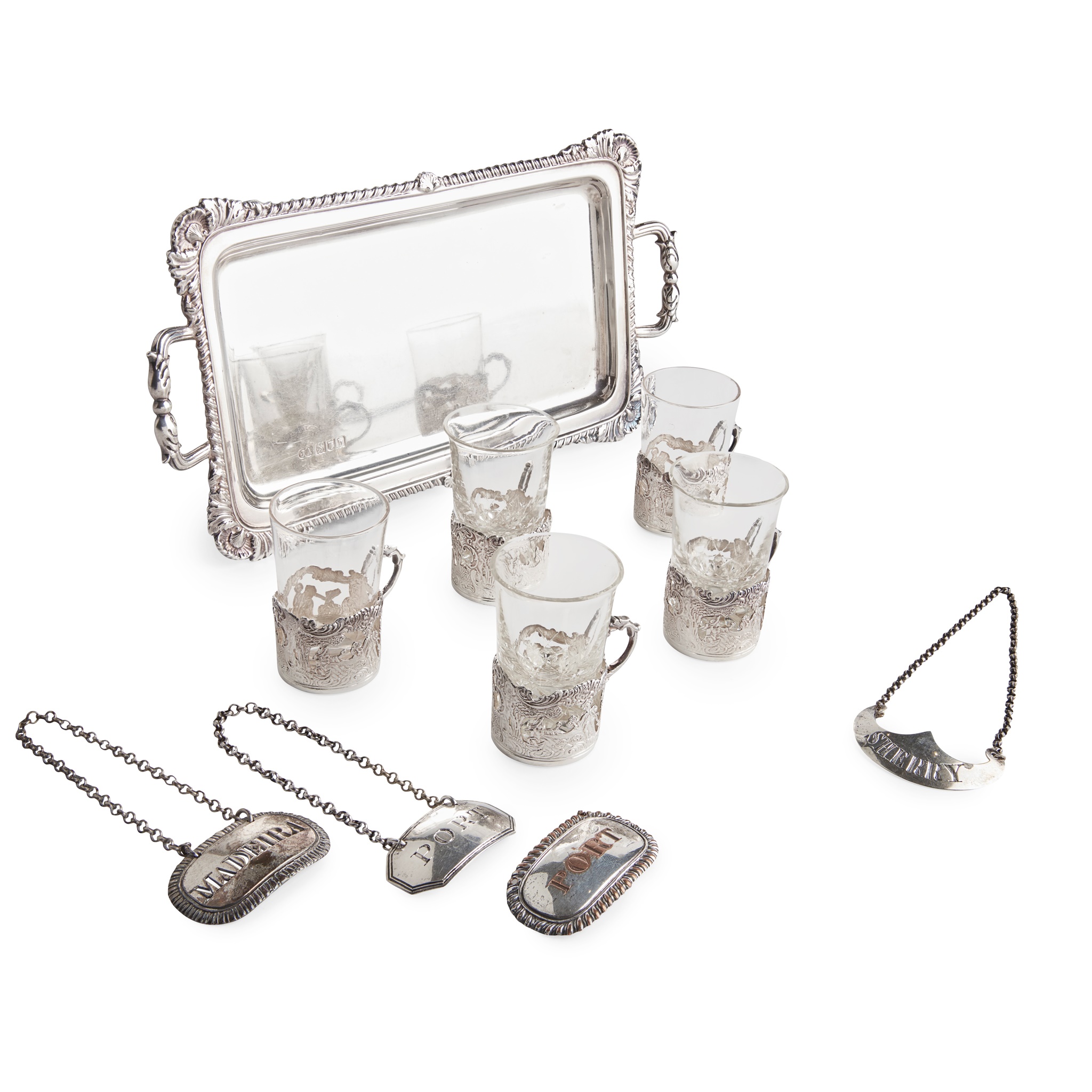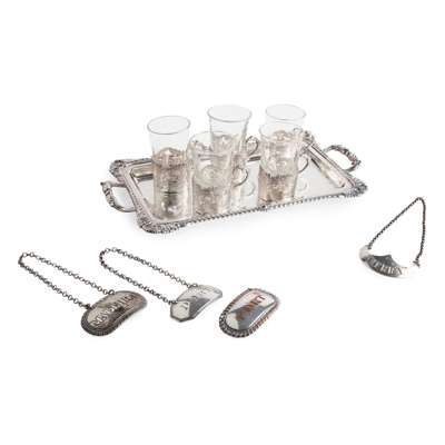 Joseph Angell, London 1903, the tray of rectangular outline with a cast gadrooned and shell border, the five various glass holders of pierced outline with pastoral scenes; together with various drinking and wine labels, one plated