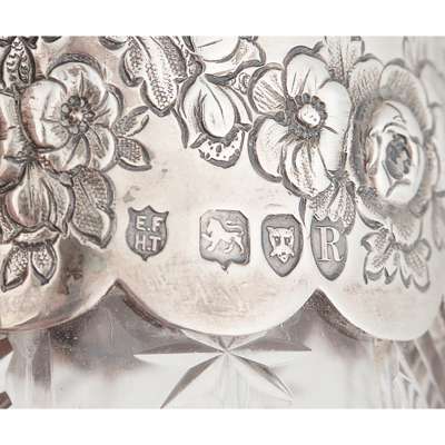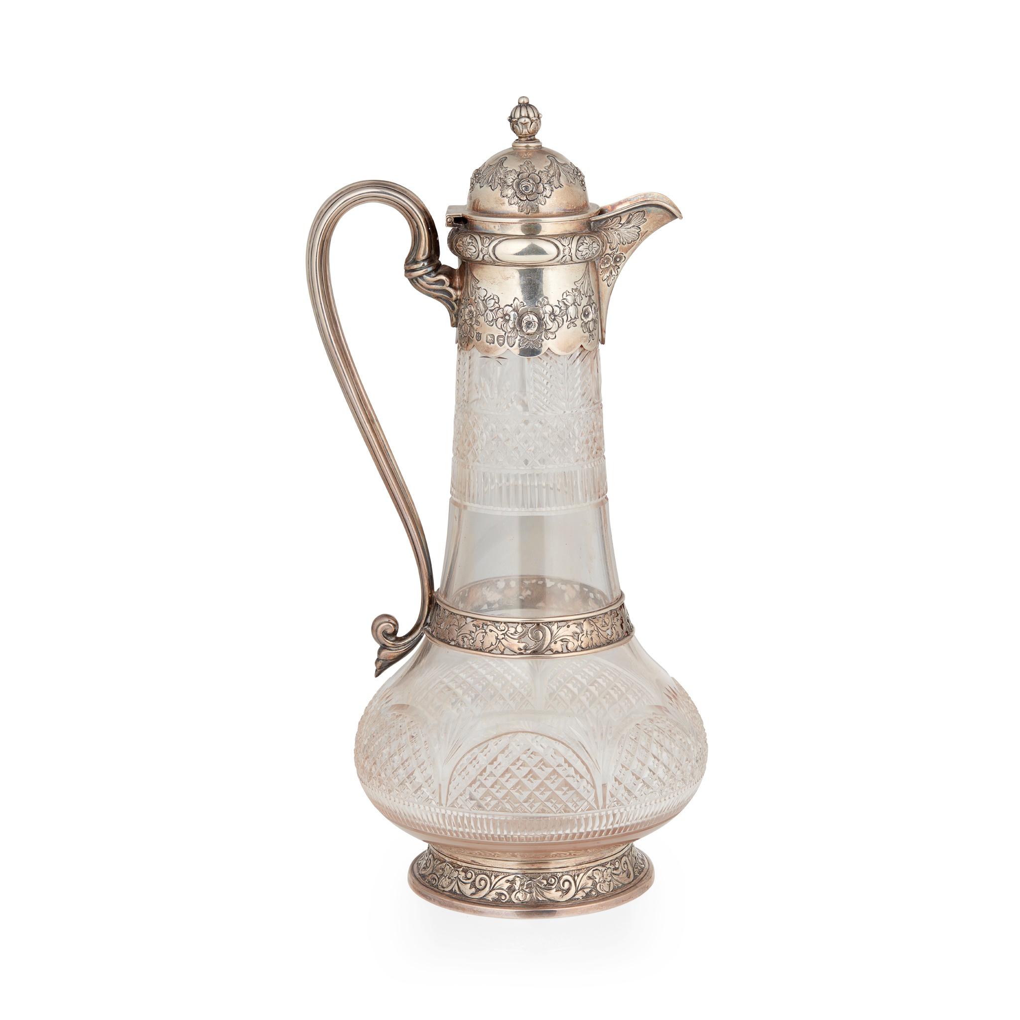 Edgar Finlay, Hugh Taylor, London 1892, the cut crystal body with hob nail cut detail, flared lower section and narrow tall neck, the plain scroll handle to a collar with embossed trailing flowers, domed hinged cover similarly decorated ball finial, engraved spout, silver foot