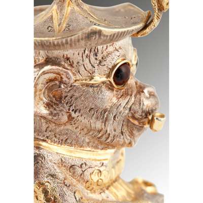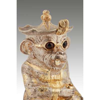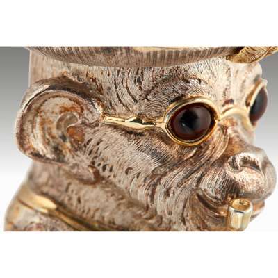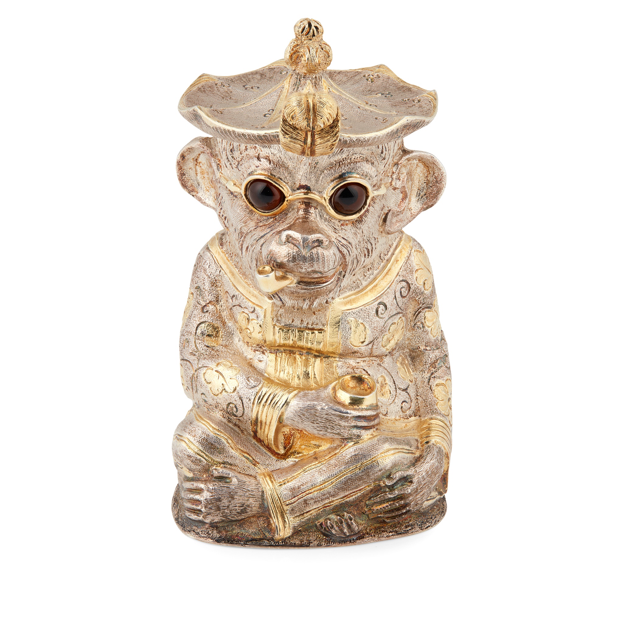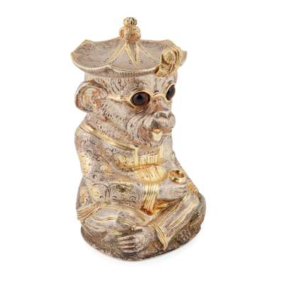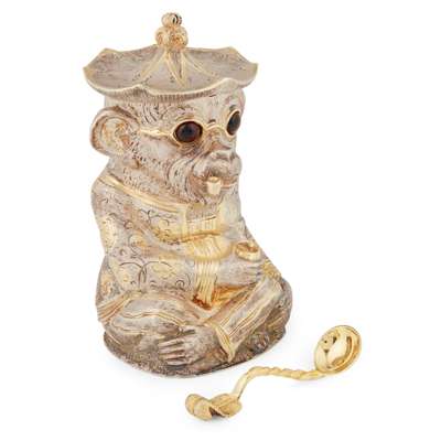 Richards & Brown, London 1867, modelled as a chimpanzee sitting cross-legged wearing an Oriental jacket and smoking a pipe, with spectacles and holding a beaker, allover matted ground and engraved scroll and floral decoration, the hinged cover formed as a hat and spoon finial as the central plume, silver-gilt liner to interior, engraved to underside W.B.E and Victorian registration mark for 26 February (indistinct year, possibly 1842)