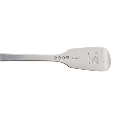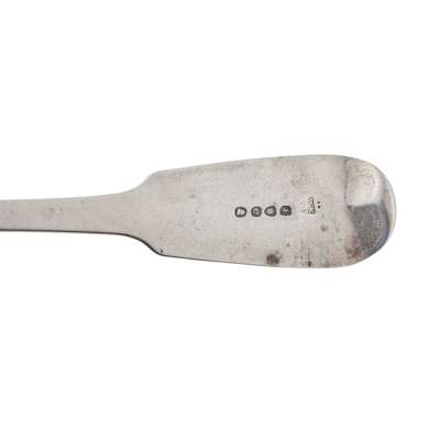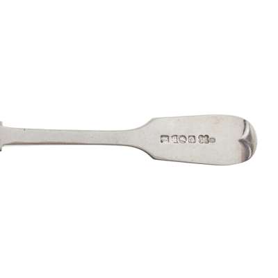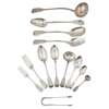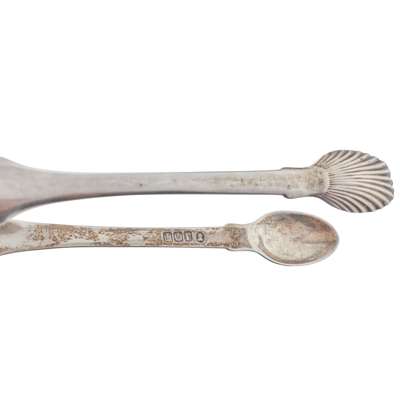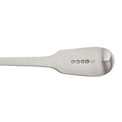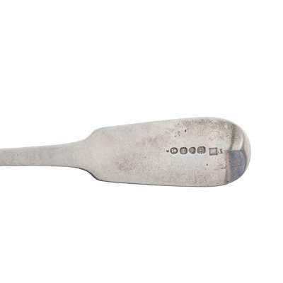 mainly William Theobalds, London 1836/7, comprising a soup ladle, a pair of serving spoons, seven tablespoons, six dessert spoons, a sauce ladle, eleven table forks, eight dessert forks, two tea spoons, three condiment spoons, of Fiddle pattern with crest engraved to terminal; together with a large serving spoon modelled as an egg spoon and the other modelled as a runcible spoon; a plated dessert spoon, a plated teaspoon and a pair of sugar tongs, Edinburgh with shell bowls