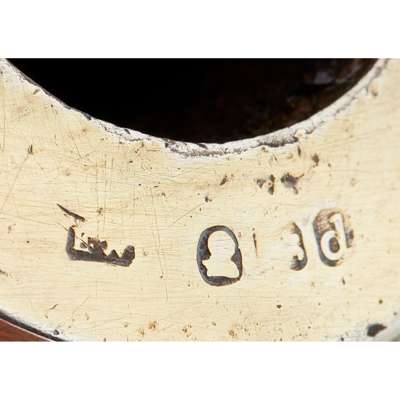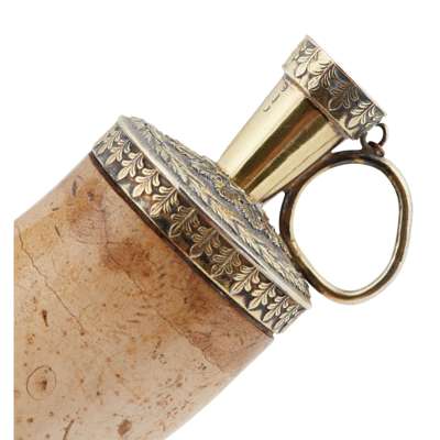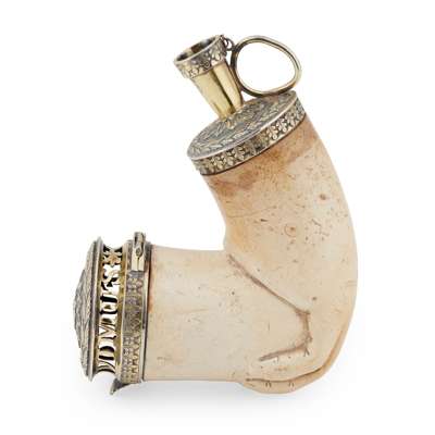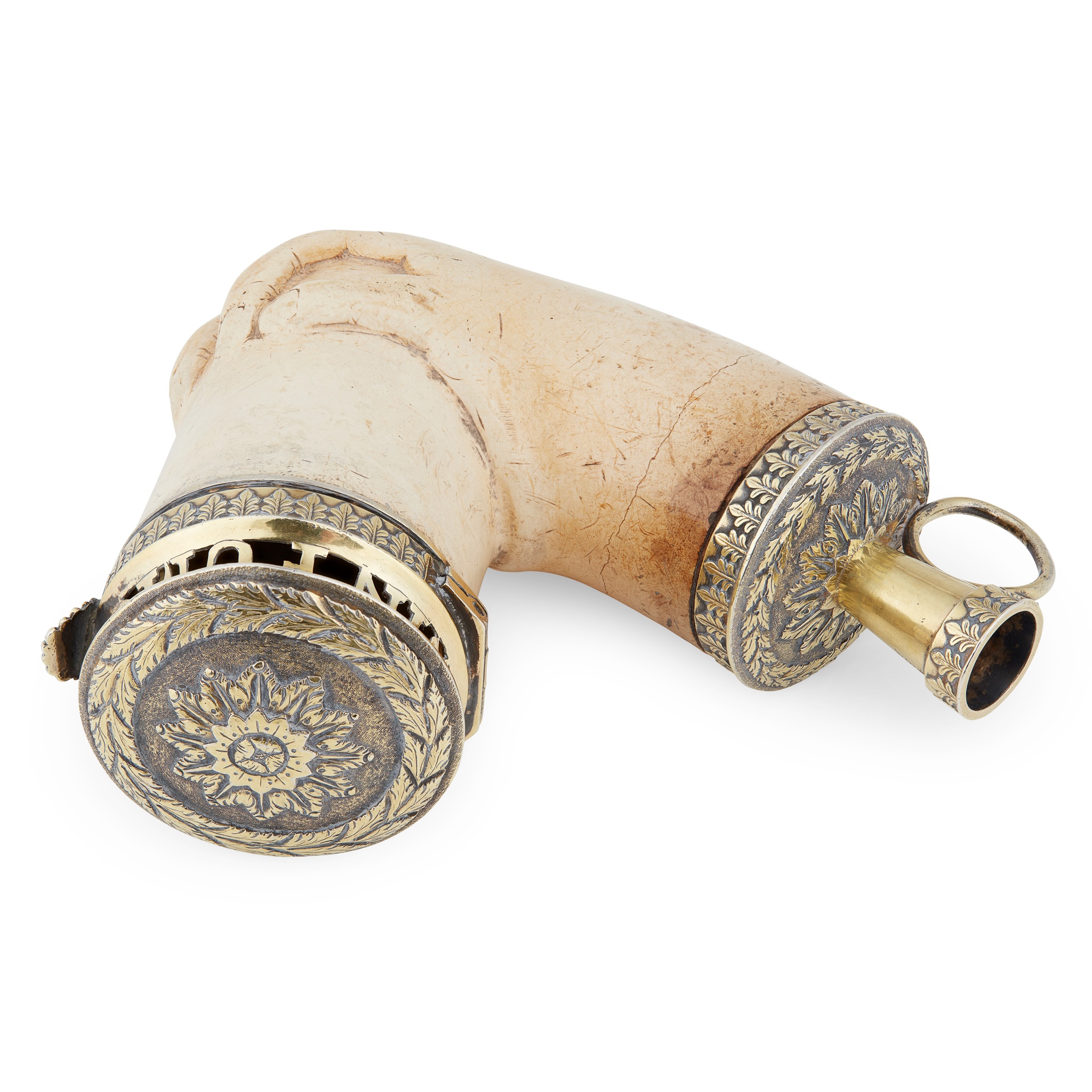 Edward Witham, London 1819, the plain bulbous L-shaped meerschaum bowl modelled as a hand, silver-gilt mounts with classical foliate motif borders, the hinged wind-cap with cut-card motto, 'IN FUMO VIVIMUS', with an embossed flower to lid in a foliate border