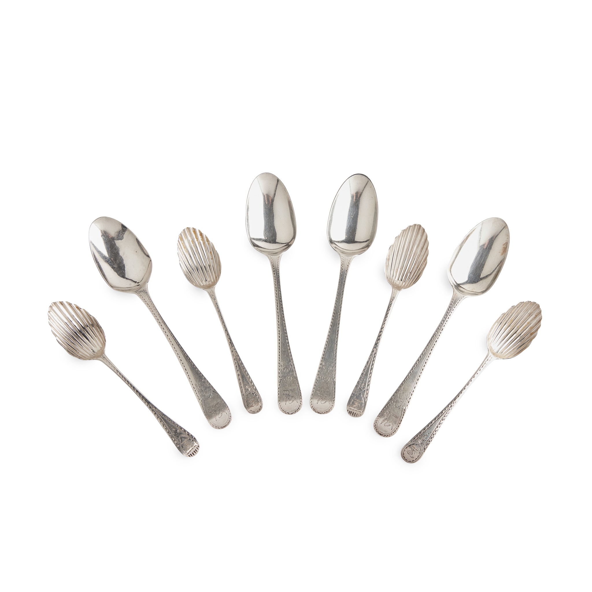 six dessert spoons, Richard Crossley, London 1786 and five for William Eley & William Fearn, London 1801 and one unascribed, all of Old English pattern with, engraved crest to terminal; together with a matched set of twelve teaspoons, with shell bowls and similar bright-cut engraved decoration to stems