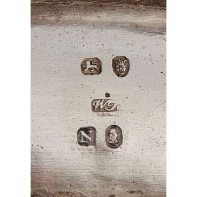 William Fountain, London 1808, each of rounded rectangular 'bath' outline with fluted border, embossed foliate border to body with engraved Y below, with leaf clasped scroll handles, the rounded rectangular stem and foot each with a Greek key border