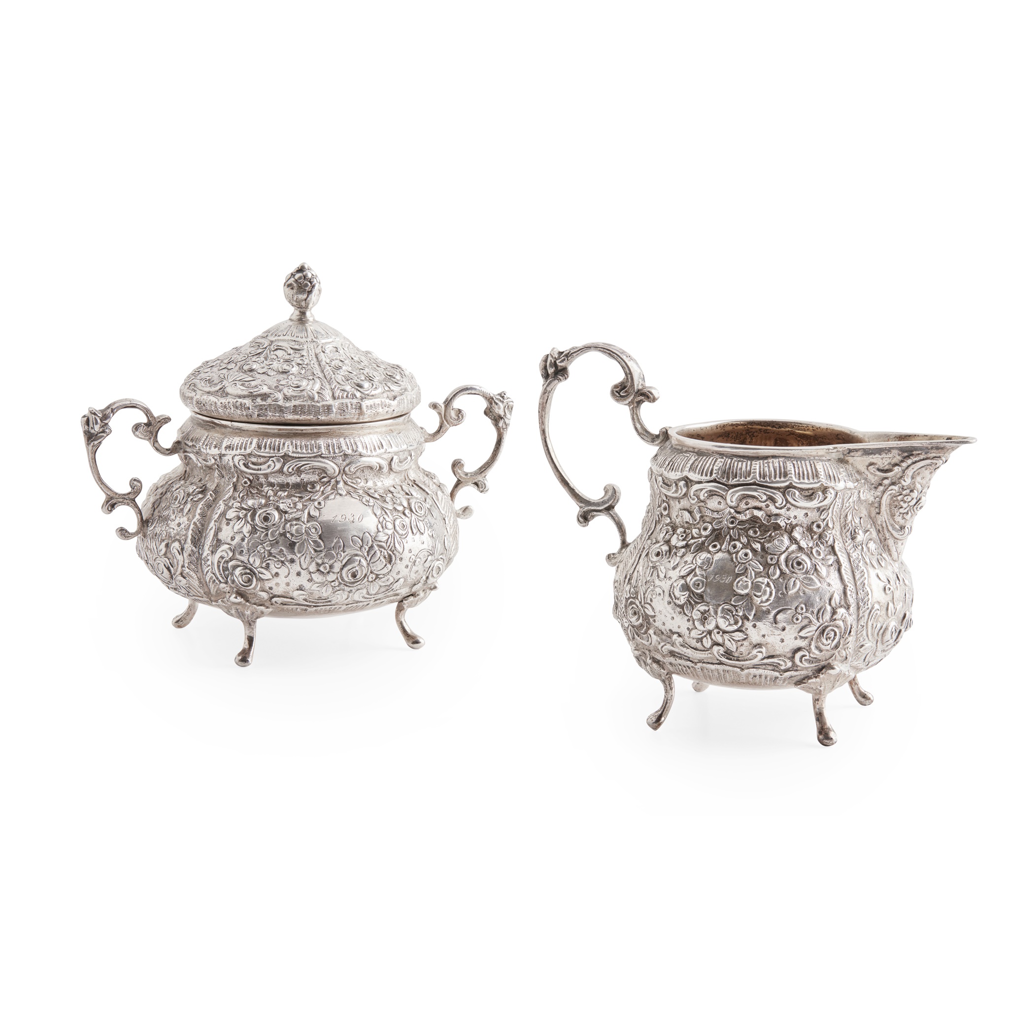 each with possible marks for Latvia 875, of squat baluster form with all-over chased floral decoration, engraved initials to one oval cartouche and 1930 to the other, the handles of ornate S-scroll form, raised on four leaf clasped feet