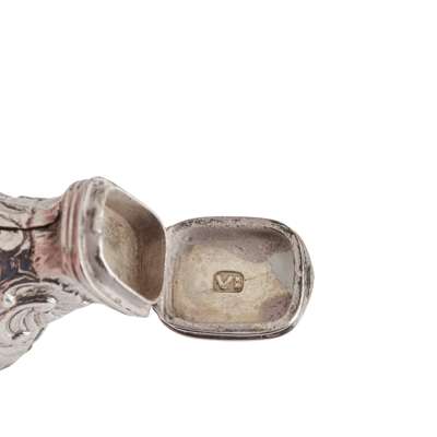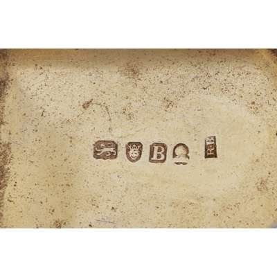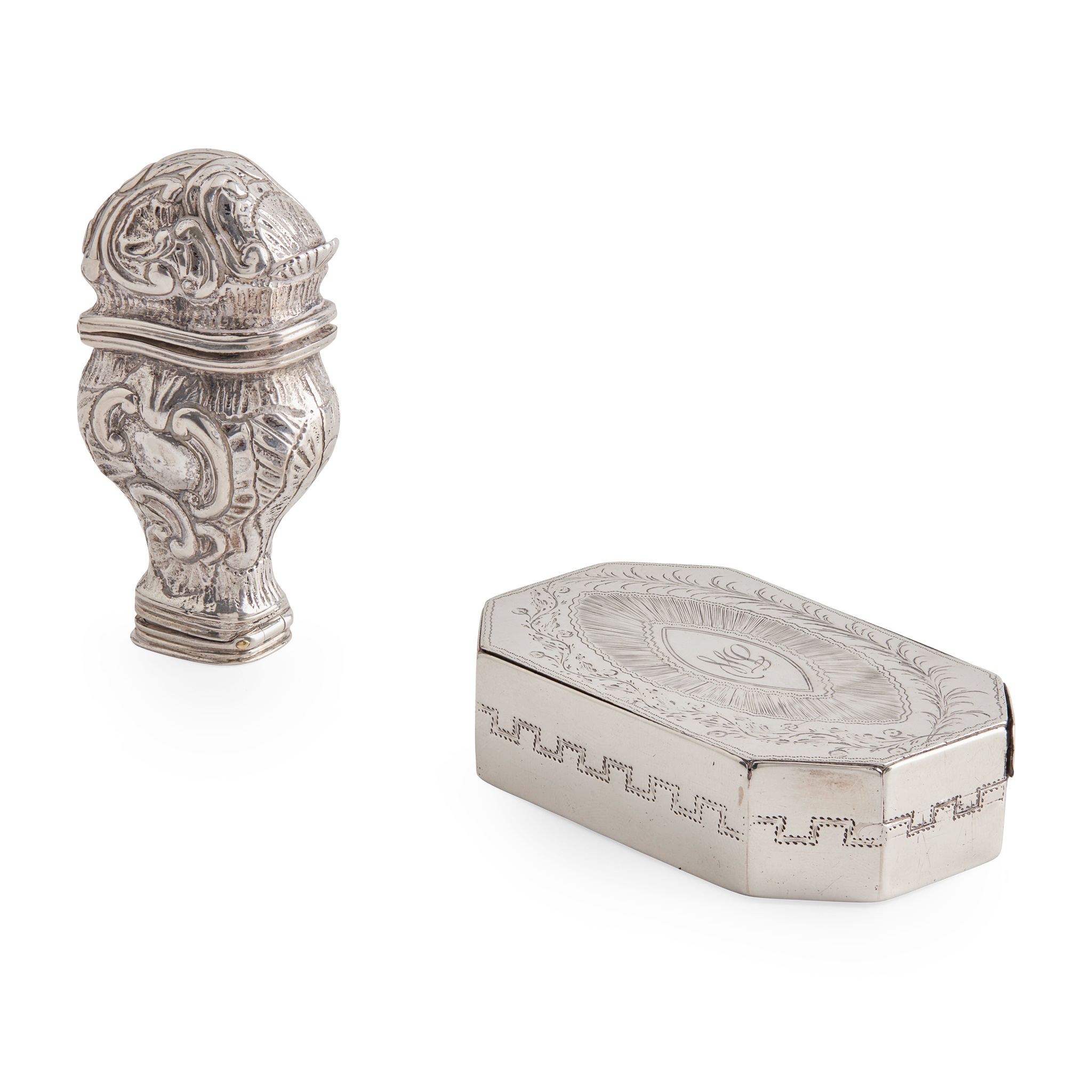 Robert Burton London 1797, of octagonal outline, with bright-cut engraved foliate detail to an oval centre with engraved initials, the sides with Greek Key detail; together with a continental double-ended snuff box, marked VI to inside of lid, of baluster form, embossed floral decoration to the baluster body, prick engraving to hinged lid '...1830'