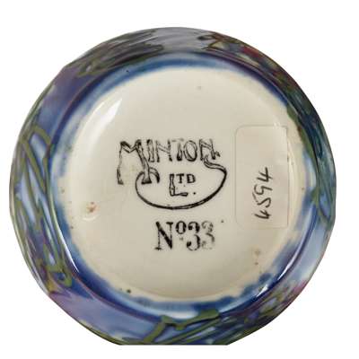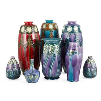 tube-lined earthenware, printed 'MINTONS LTD.' and 'No. 1', impressed with date cypher for 1911 and 'MINTONS' and '3707' to two of the vases, each 31.8cm (12 1/4in) high; together with a MINTONS VASE, 1918, impressed 'MINTONS' and date cypher for 1918, 22.5cm (8 3/4in) high; a FURTHER VASE, printed 'MINTONS LTD.' and 'No. 18', 21cm (8 1/4in) high; a PAIR OF MINTONS VASES, printed 'No. 30' and 'MINTONS LTD.', 12cm (4 3/4in) high; and another MINTONS VASE, printed 'MINTONS LTD.' and 'No. 33', 12cm (4 3/4in) high