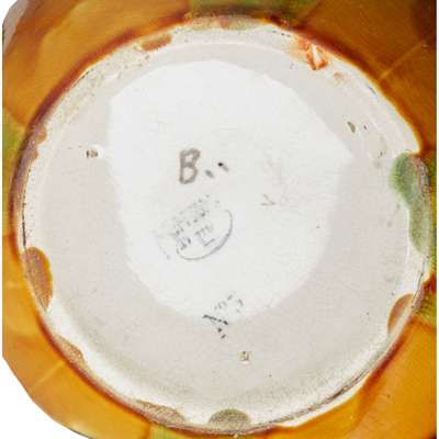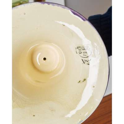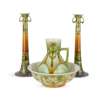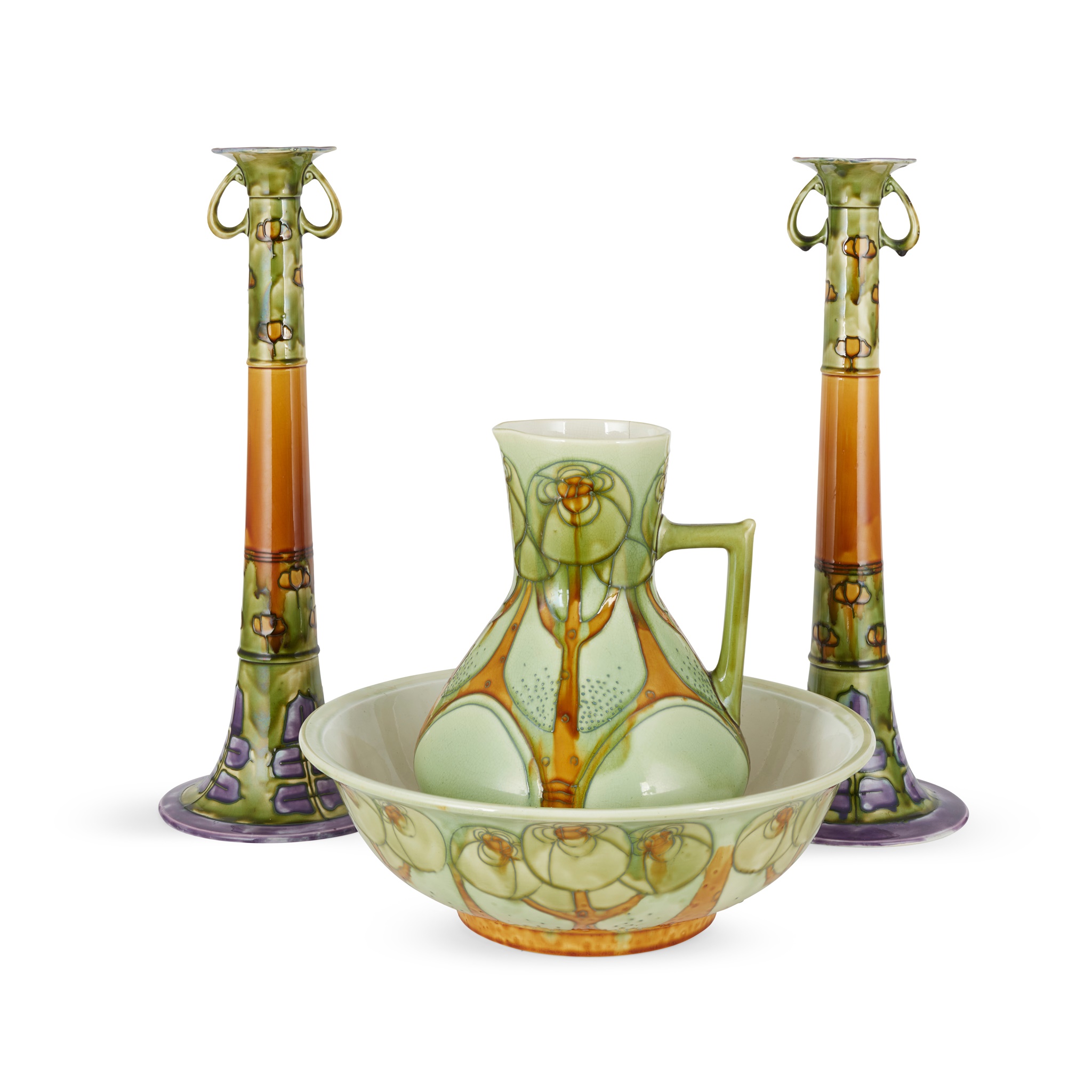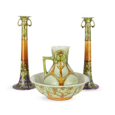 tube-lined and slip-glazed earthenware, printed 'MINTON LTD.' and 'No. 2' , impressed 'Minton', 52cm (20 1/2in) high; together with a JUG AND WASH SET, printed 'MINTON LTD.' and 'No. 5', moulded mark 'Minton' to the basin, impressed marks to the ewer and painted 'B', ewer 31cm (12 1/4in) high, basin 38.5cm (15 1/8in) diameter
