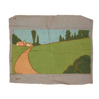 made by Ellen Wadsworth, stitched to a linen ground, the panel 21cm x 38cm (8 1/4in x 15in); together with an EMBROIDERED RUNNER BY JOHN WADSWORTH, made by Ellen Wadsworth, coloured silks on a linen ground, 66cm (26in) x 46cm (18 1/2in); and a CUSHION COVER BY JOHN WADSWORTH, machine woven, 51cm (20in) square