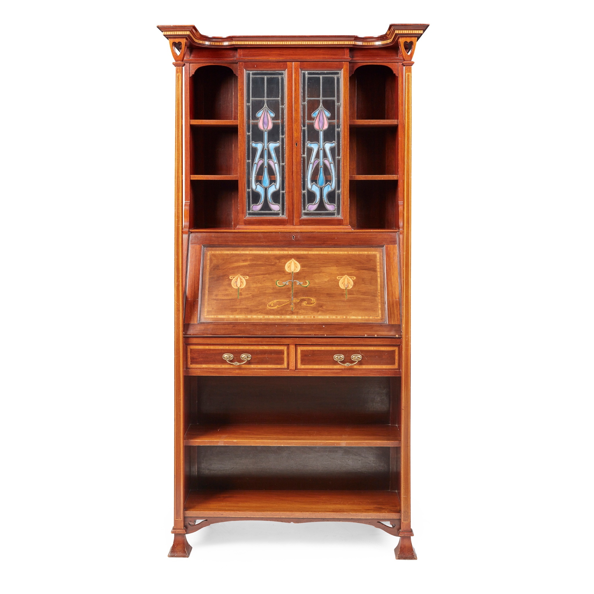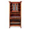 mahogany, marquetry inlay with pewter and boxwood lining, stained and leaded glass panels