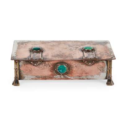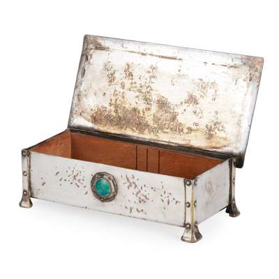 silver plated copper and brass, with Ruskin ceramic cabochons