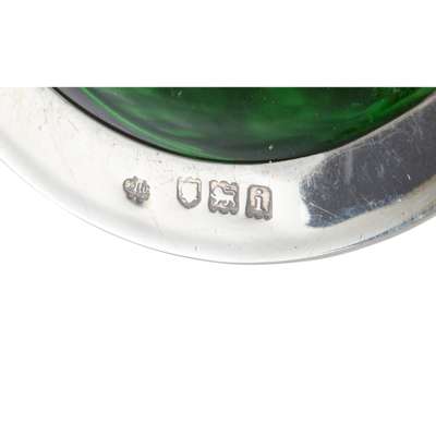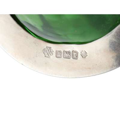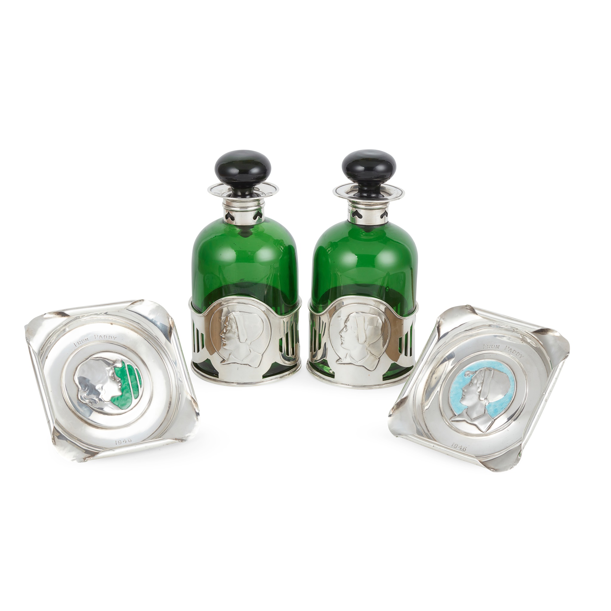 green glass with silver mounts, stamped maker's mark, one hallmarked Sheffield 1909-10, the other London 1904-05, 16cm (6 1/4in) high; together with TWO DISHES, silver and enamel, each hallmarked London, one 1904-05 and 1905-06, each inscribed 'FROM PADDY/ 1946', 10cm (3 7/8in) square