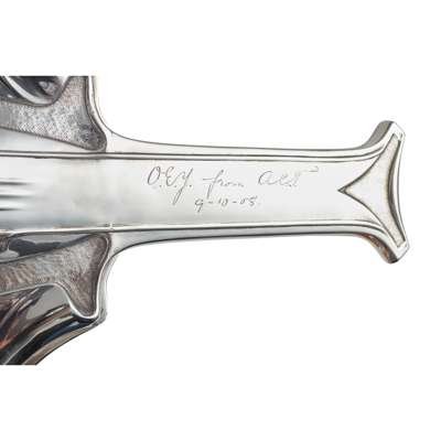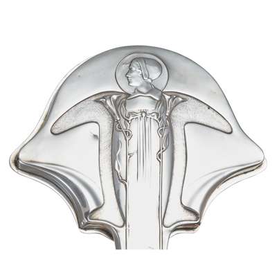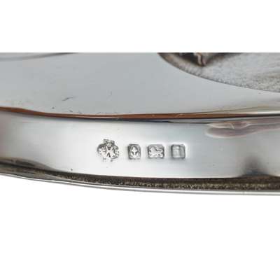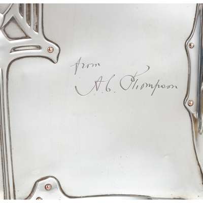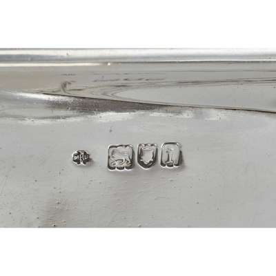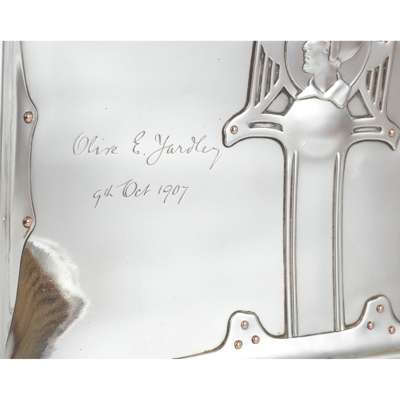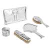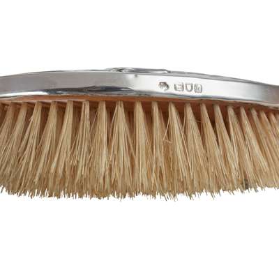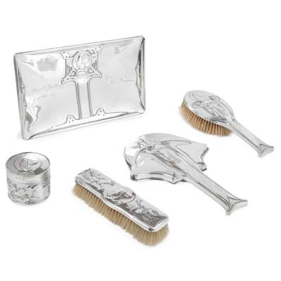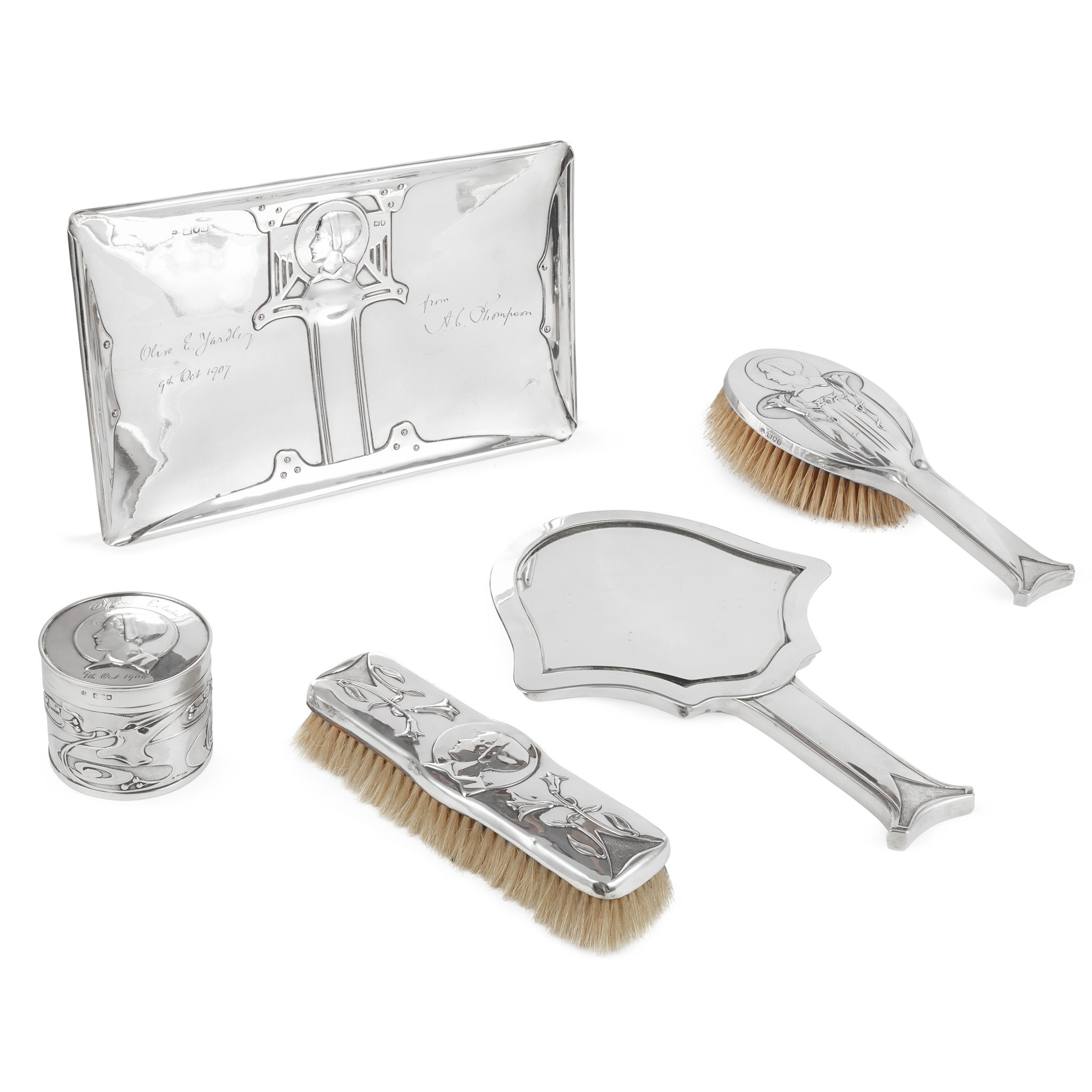 silver, comprising a HAND MIRROR, with a mirrored glass plate, inscribed 'O. E. Y. from a. e. J./ 9-10-08', hallmarked Birmingham 1908, 29.2cm (11 1/2in) long; a HAIR BRUSH, hallmarked London 1903, stamped 'RD 347101', 24.8cm (9 3/4in) long; a CLOTHES BRUSH, indistinct hallmarks, 9cm (7 1/2in) long; a POWDER BOX, inscribed 'Olive Eileen/ 9th Oct 1904', stamped 'RD 352424', cover with indistinct hallmarks, base hallmarked London 1904, 6.5cm (2 1/2in) high; and a TRAY, inscribed 'Olive E. Yardley/ 9th Oct 1907/ from A. L. Thompson', hallmarked (twice) London 1904, 30.5cm (12in) long