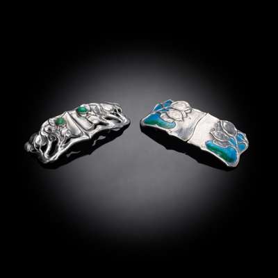 silver and enamel, 9cm (3 1/2in) wide; together with a further BELT BUCKLE BY KATE HARRIS FOR WILLIAM HUTTON & SONS LTD., silver, set with green cabochons, 8.8cm (3 1/2in) wide, each with stamped manufacturer's marks and hallmarked Birmingham 1902