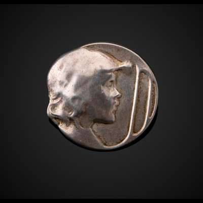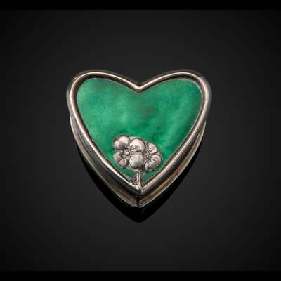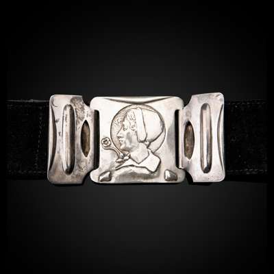 silver, and inscribed 'W. C. CONNELL / 83 CHEAPSIDE LONDON', hallmarked London 1899, with bracket fittings and later black suede belt, 11.5cm (4 1/2in) wide including the bracket fittings; together with a PILL BOX BY KATE HARRIS FOR WILLIAM HUTTON & SONS LTD., silver and enamel, stamped maker's marks, hallmarked Birmingham 1902, 4cm (1 1/2in) wide; and a BADGE BY KATE HARRIS FOR WILLIAM HUTTON & SONS LTD., silver, hallmarked Birmingham 1907 and partial registration number '4109..', 2.5cm (1in) wide