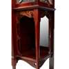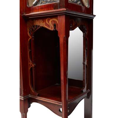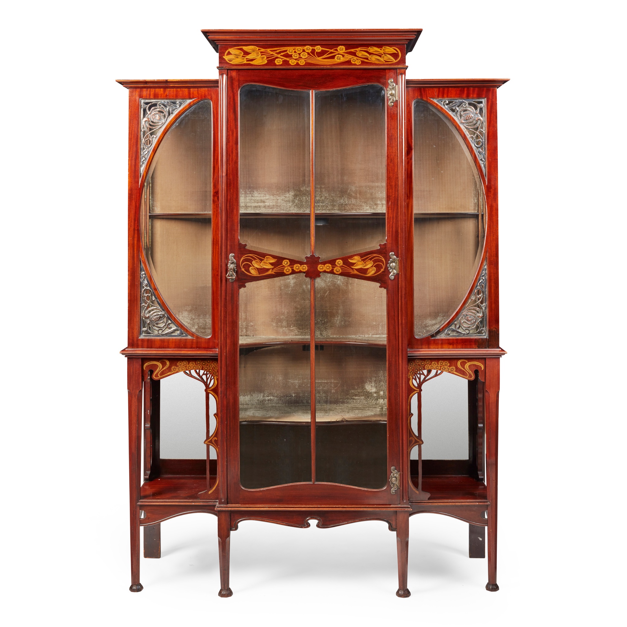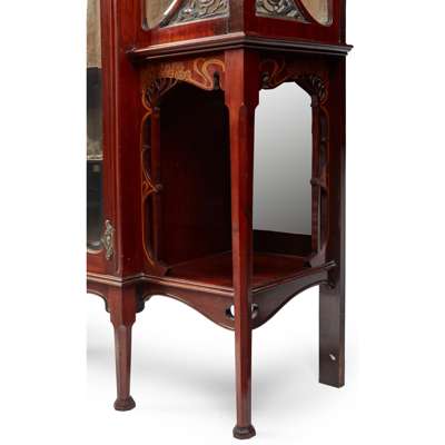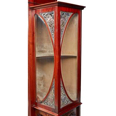 mahogany, marquetry inlay and decorated with penwork, applied silvered metal, bevelled glass, with plush lining and key