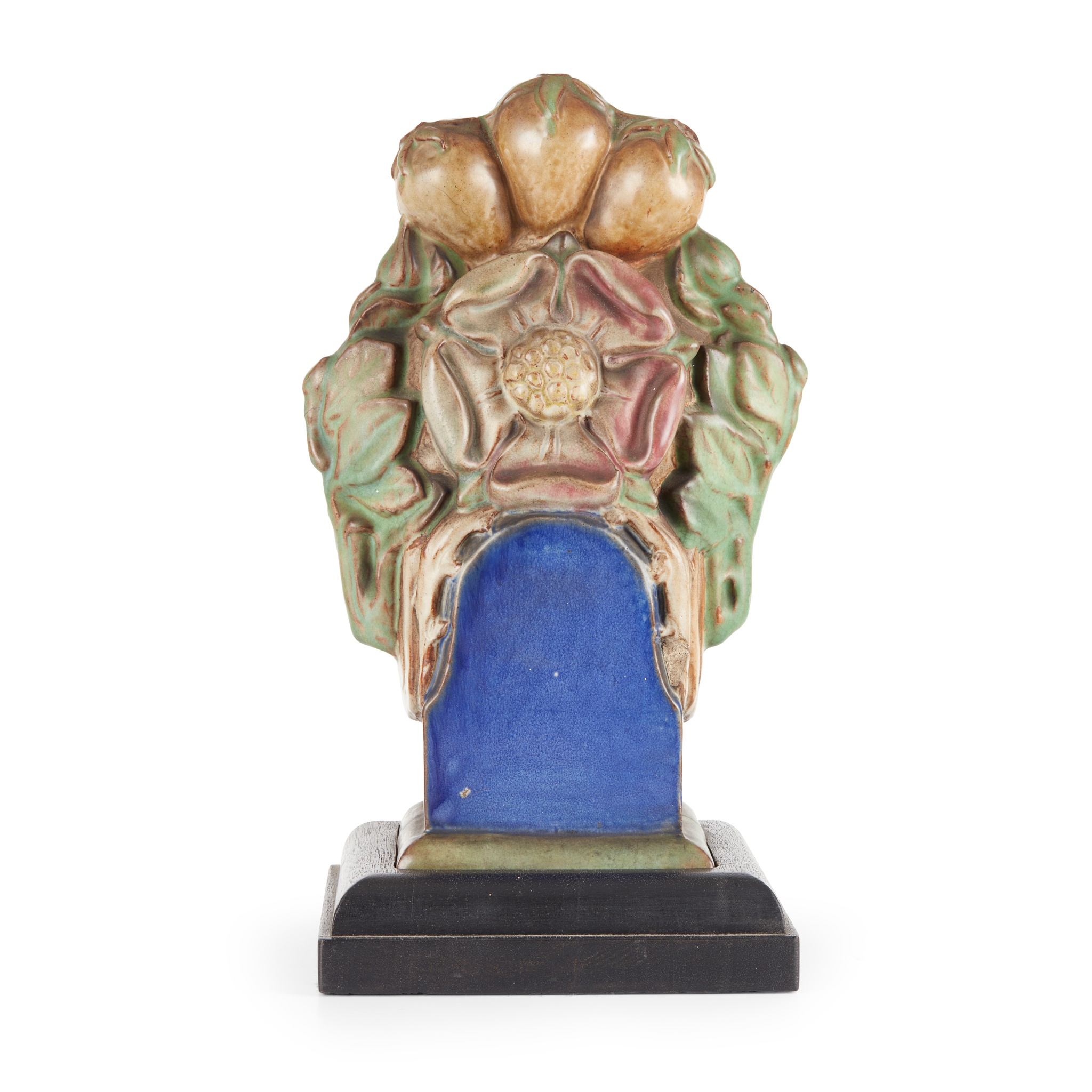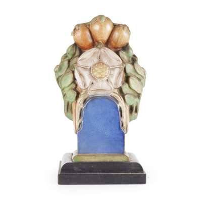 All the post finials and relief panels were made by Royal Doulton between 1931 and 1938 and, as well as at Somerstown the Society, Doulton commissioned these embellishments by Bayes at their other London projects. This Rose finial, for example, was used at the York Rise Estate (1937-8) near Highgate Hill and the Ship finials at St. Francis and St. Martins flats.