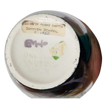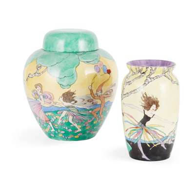 on Carltonware blank, painted with fairies, painted monogram 'EMW' (to the base), 22cm (8 5/8in) high; together with an ELIZABETH MARY WATT VASE, painted monogram 'EMW' (to the base), 17.5cm (6 7/8in) high