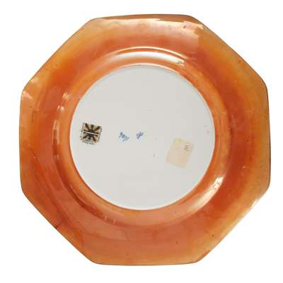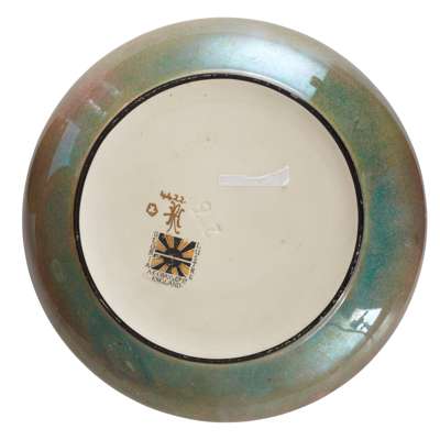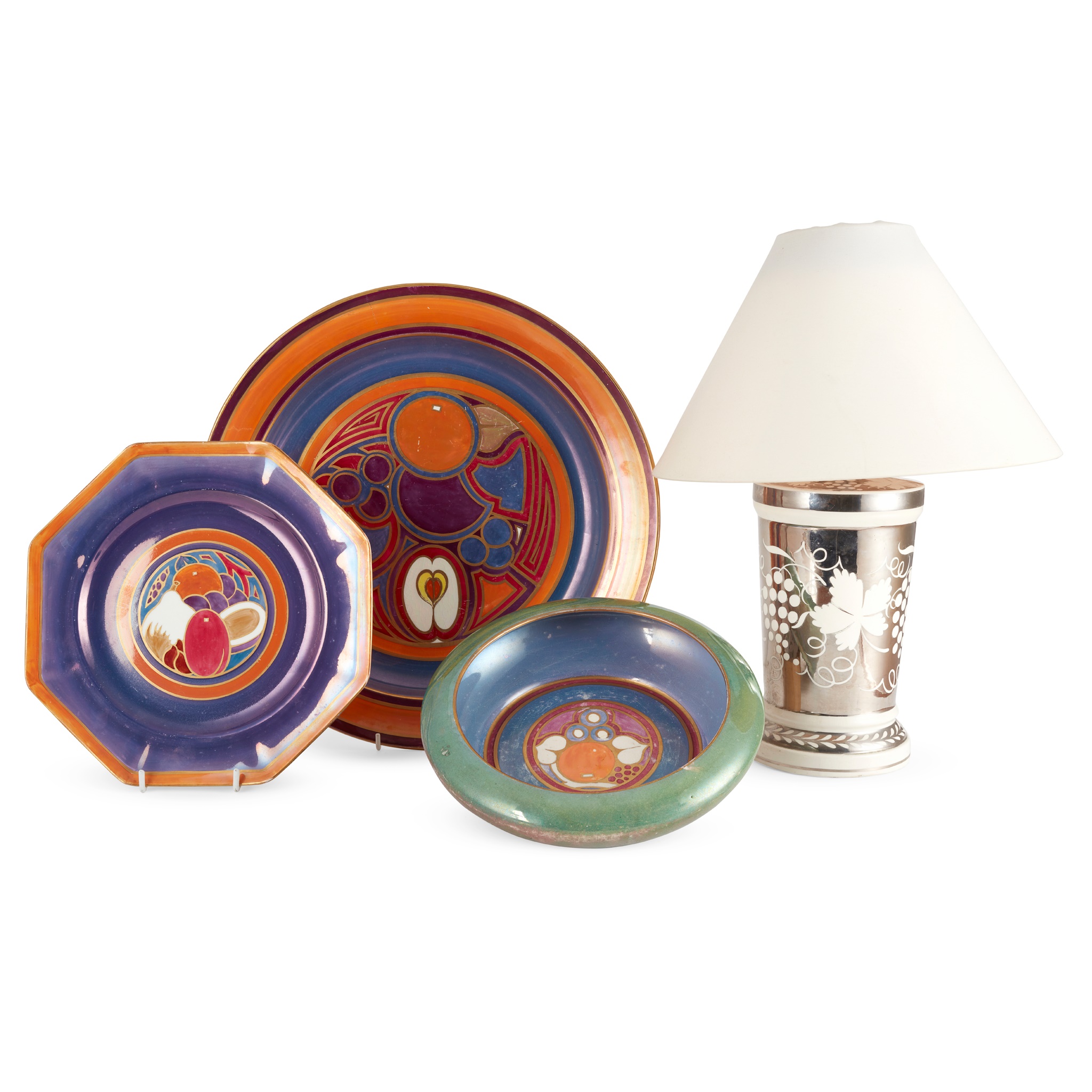 glazed earthenware with lustre highlights, printed manufacturer's stamp, 36.5cm (14 3/8in) diameter; together with an A. E. GRAY & CO. OCTAGONAL PLATE AND BOWL, glazed earthenware with lustre highlights, each with printed manufacturer's stamp, plate 25cm (9 7/8in) diameter; bowl 24cm (9 3/8in) diameter; and an associated GRAY'S POTTERY LAMP BASE, glazed earthenware with lustre highlights, with later shade printed manufacturer's stamp, 23cm (9in) high to fitting
