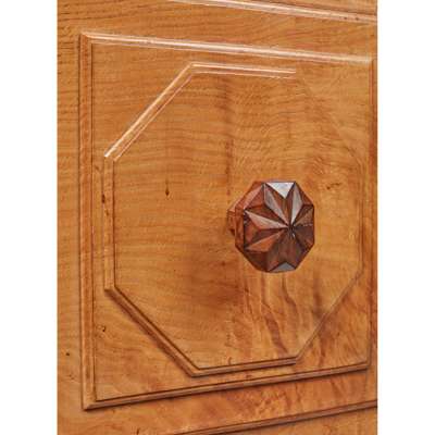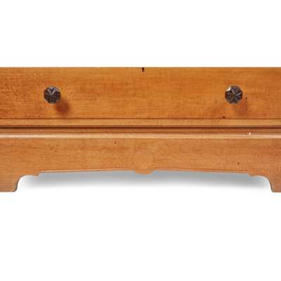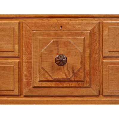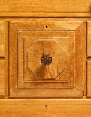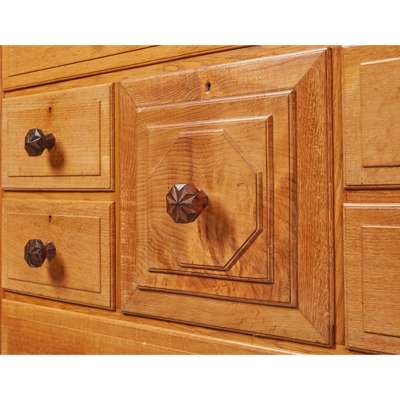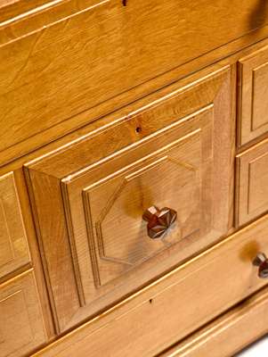 Note: The Goddard family of Leicester were chemists who patented mercury-free silver and brass polishes, building a large business whose brand name is still synonymous with metal polishes today. They were major patrons of Peter Waals and commissioned many pieces of furniture from him in the 1920s and 30s. The current lot was made for Harold Goddard and can be seen in a period photograph of the dining room at Lyndwood, his home in Leicester. The metal-lined drawer was designed for filing however may have later been used for silver as has a later removable baize cloth to the base.