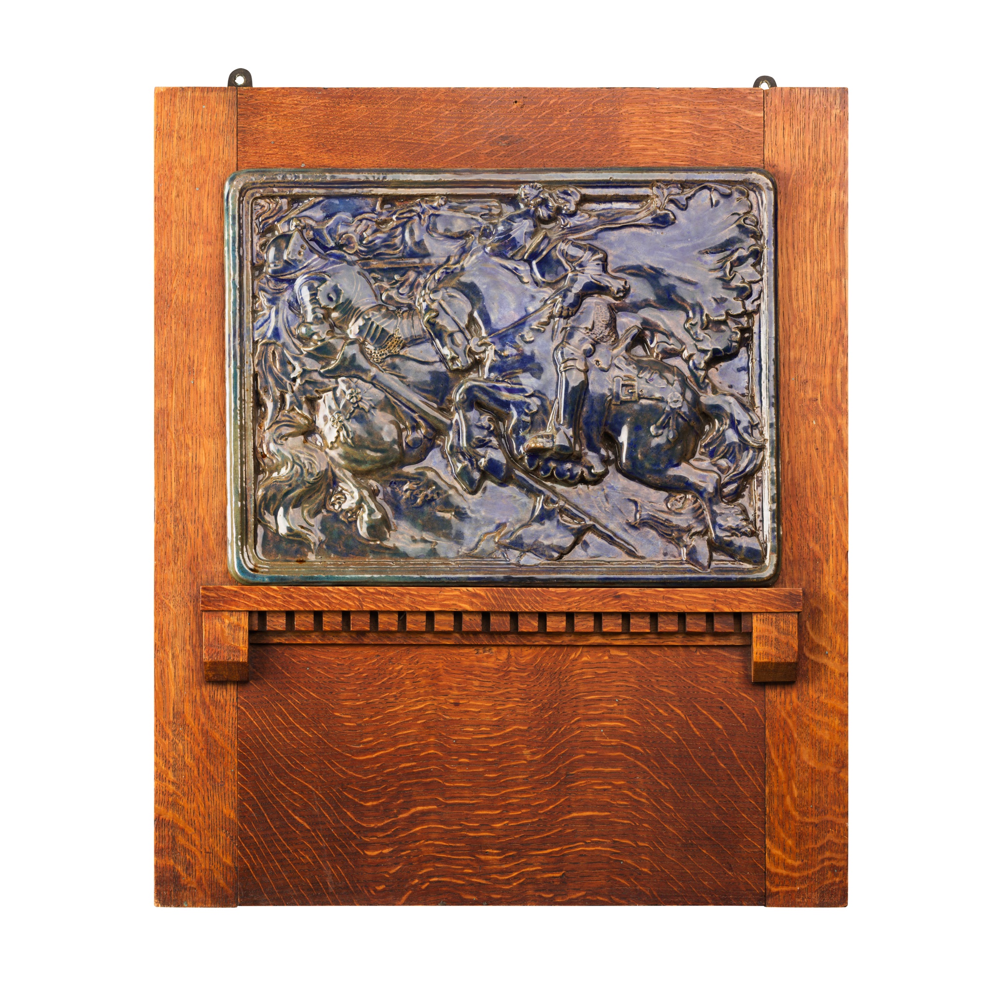 glazed ceramic relief plaque mounted in original oak frame, dated '30 / 0 / 12' and marked with artist mark (to the reverse), bears artist's label dated October 1912, gallery label inscribed 'Executed by Mr. S. Thorogood Artmaster, Berslum, Accepted at the National Gallery 1912. Given to Mr A F Wenger, November 1912'