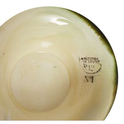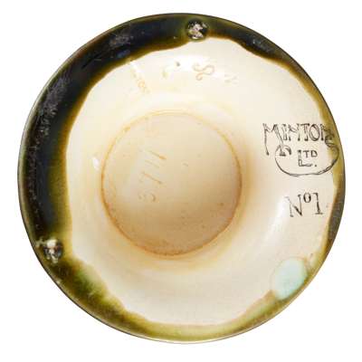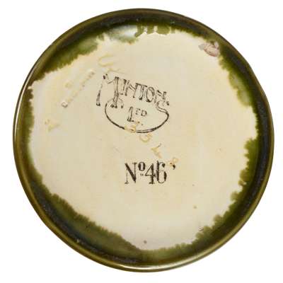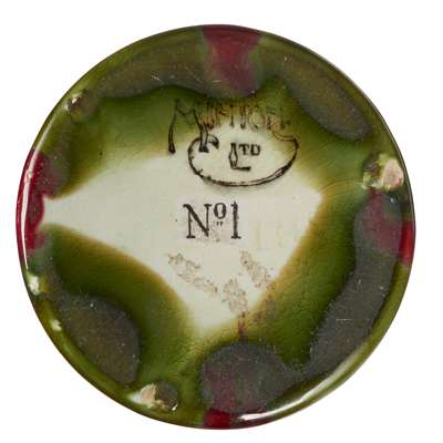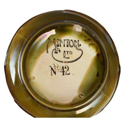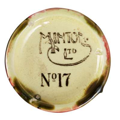tube-lined and glazed earhenware, printed 'MINTONS LTD.', 38.4cm (15 1/8in) diameter; together with a MINTONS VASE, printed 'MINTONS LTD.' and 'No. 1', impressed 'MINTONS', incised '3652', 29.5cm (11 5/8in) high; a MINTONS VASE, indistinctly stamped 'MINTONS', impressed '3709', 29.5cm (11 5/8in) high; and a MINTONS VASE, printed 'MINTONS LTD.' and 'No. 1', 24cm (9 1/2in) high; a MINTONS VASE, printed 'MINTONS LTD' and 'No. 46', impressed 'MINTONS', incised '3548', 15.5cm (6 1/8in) high; a MINTONS VASE, printed 'MINTONS LTD.' and 'No. 42', 13.5cm (5 3/8in) high; and a MINTONS VASE, printed 'MINTONS LTD.' and 'No. 17', 13cm (5 18in) high