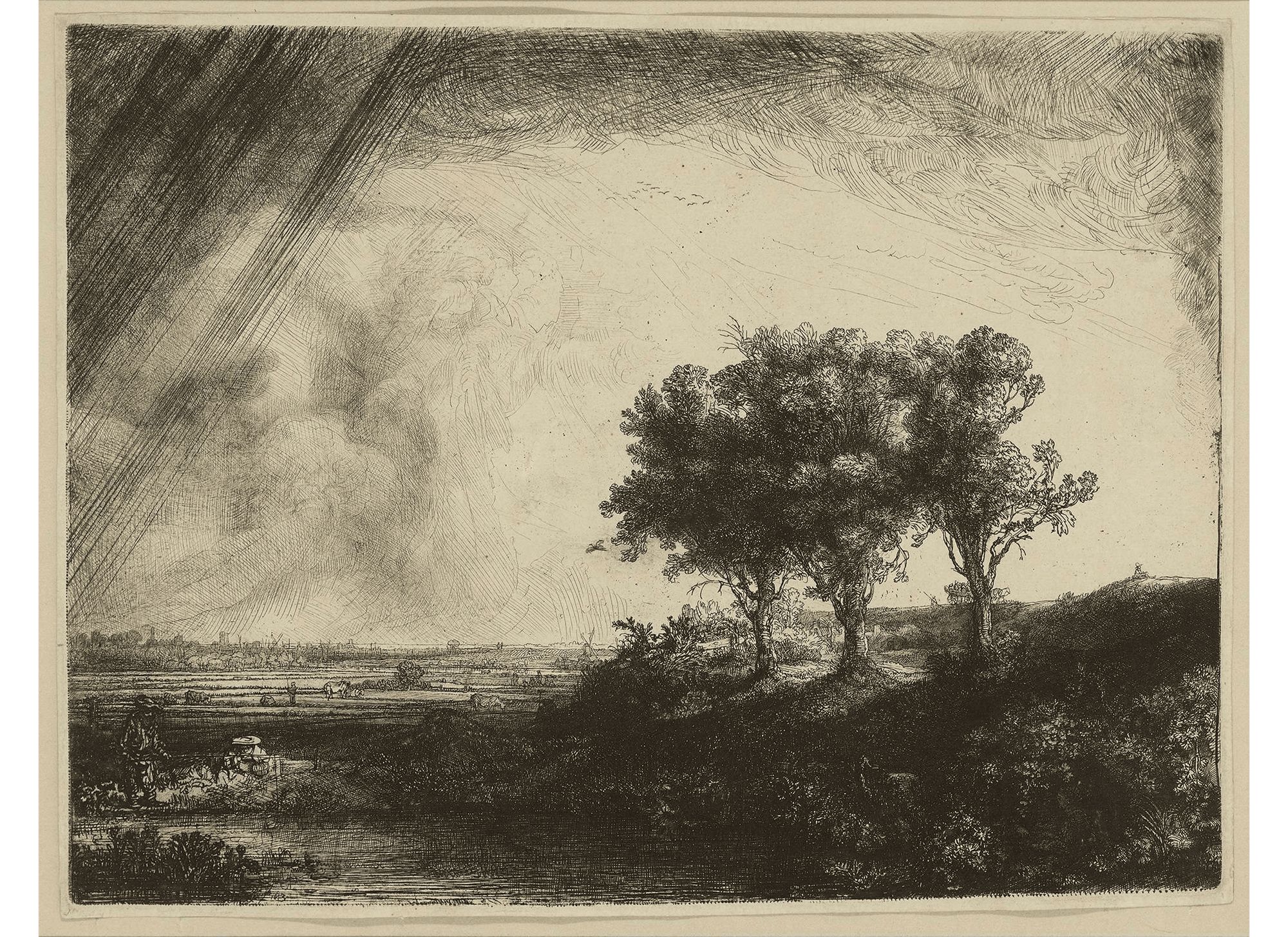 The print is a true demonstration of Rembrandt’s technical virtuosity. A symphony of light and shade, the composition is marked by his exquisite attention to detail. The sky, often left blank in his prints, sets the tone here with a combination of marks conveying sweeping clouds of varying densities and a heavy downpour of rain moving across the open landscape. Rembrandt includes a variety of figures, including the fishing couple, the artist, and the lovers, each a familiar trope derived from contemporary Dutch pastoral literature. Within the vast landscape the diminutive figurative components are deliberately difficult to discern, emphasising the dominance of nature. To create this impressive drama and atmosphere, Rembrandt combined techniques including various depths of etched lines, drypoint, engraving and speckled tone through sulphur tinting. They weave together to create a rich, luminous surface for a composition that is dramatic and poetic, revealing an artist at the height of his powers.