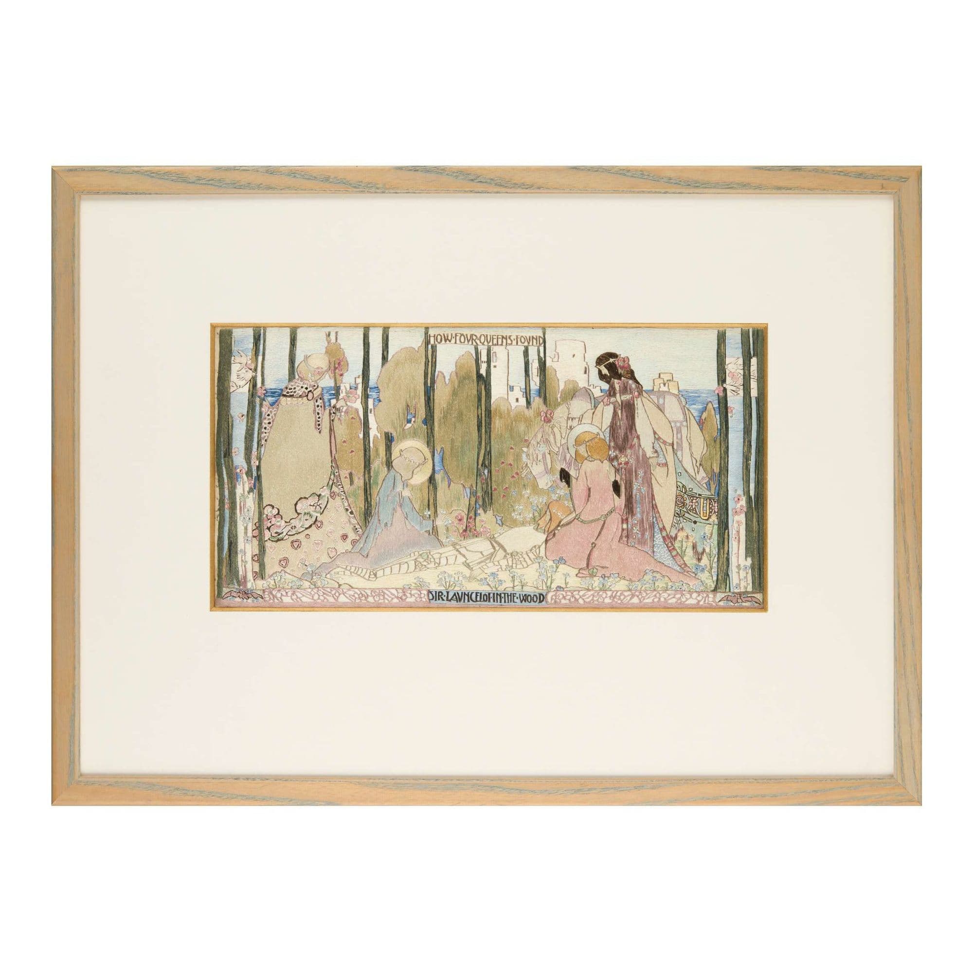A highlight in the collection, Jessie M King’s How Four Queens Found Sir Lancelot in the Wood, was executed around the time King and Taylor were living in France and running the Shearing Atelier School of Art. It can be argued that some of her finest works belong to this Paris period, including pieces considered influential to the creation of the Art Deco movement.